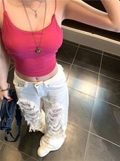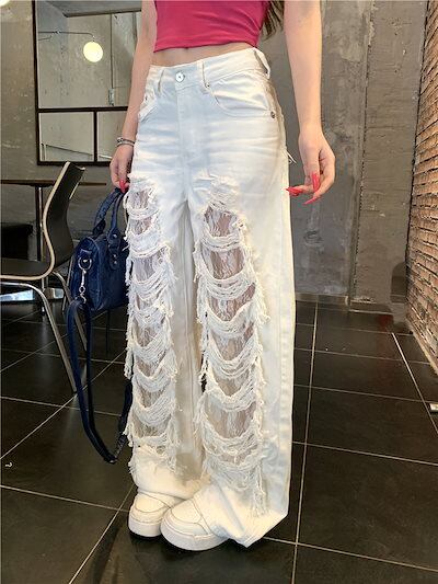 2025春夏 デニムパンツ ボトムス ハイウエスト ジーンズ K-POP ストリートファッション系モップ韓国風ファッション練習ジーンズ シルエット加工ゆったりレッグレディースカジュアルジーパン衣装白