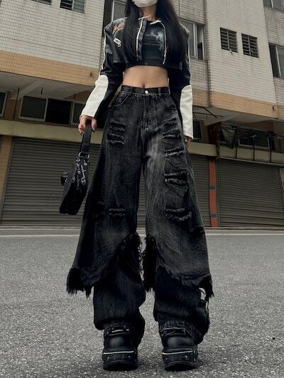 2025春夏 デニムパンツ ボトムス ハイウエスト ジーンズ K-POP ストリートファッション系モップ韓国風ファッション練習ジーンズ シルエット加工ゆったりレッグレディースカジュアルジーパン黑衣装