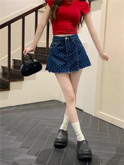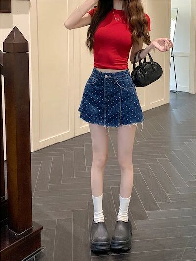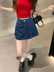 お出かけ レディース 韓国ファッション ガーリー キュート かわいい おしゃれ 夏 細見え 脚長効果 美脚効果 ハイウエスト ドット柄 Aライン デニム ショート丈 キュロット 2025春夏パンツ