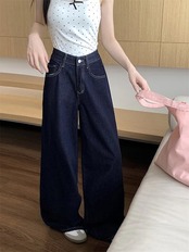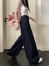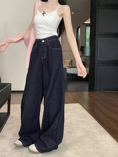 2025春夏パンツ ロング丈 デニム ジーンズ ワイド ストレート ハイウエスト 美脚効果 脚長効果 細見え 夏 レトロ インディゴブルー 韓国ファッション レディース かわいい おしゃれ カジュアル