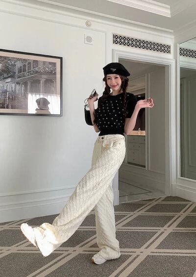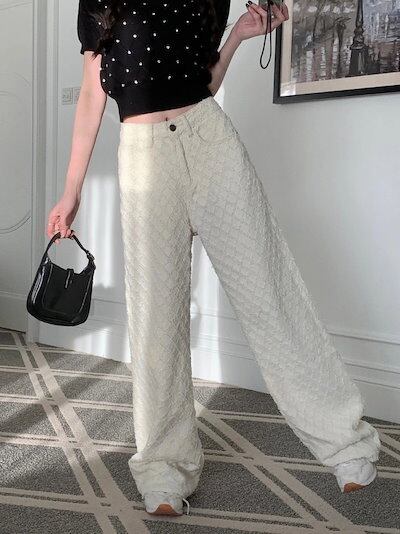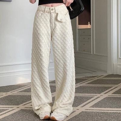 2025 春夏パンツ デニム ジーンズ モップパンツ ジャガード 菱形 ワイド ストレート ハイウエスト 脚長効果 美脚効果 細見え 春 白 ホワイト カジュアル 韓国ファッション レディース お出か