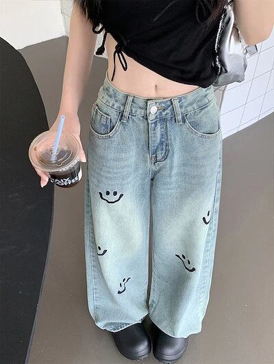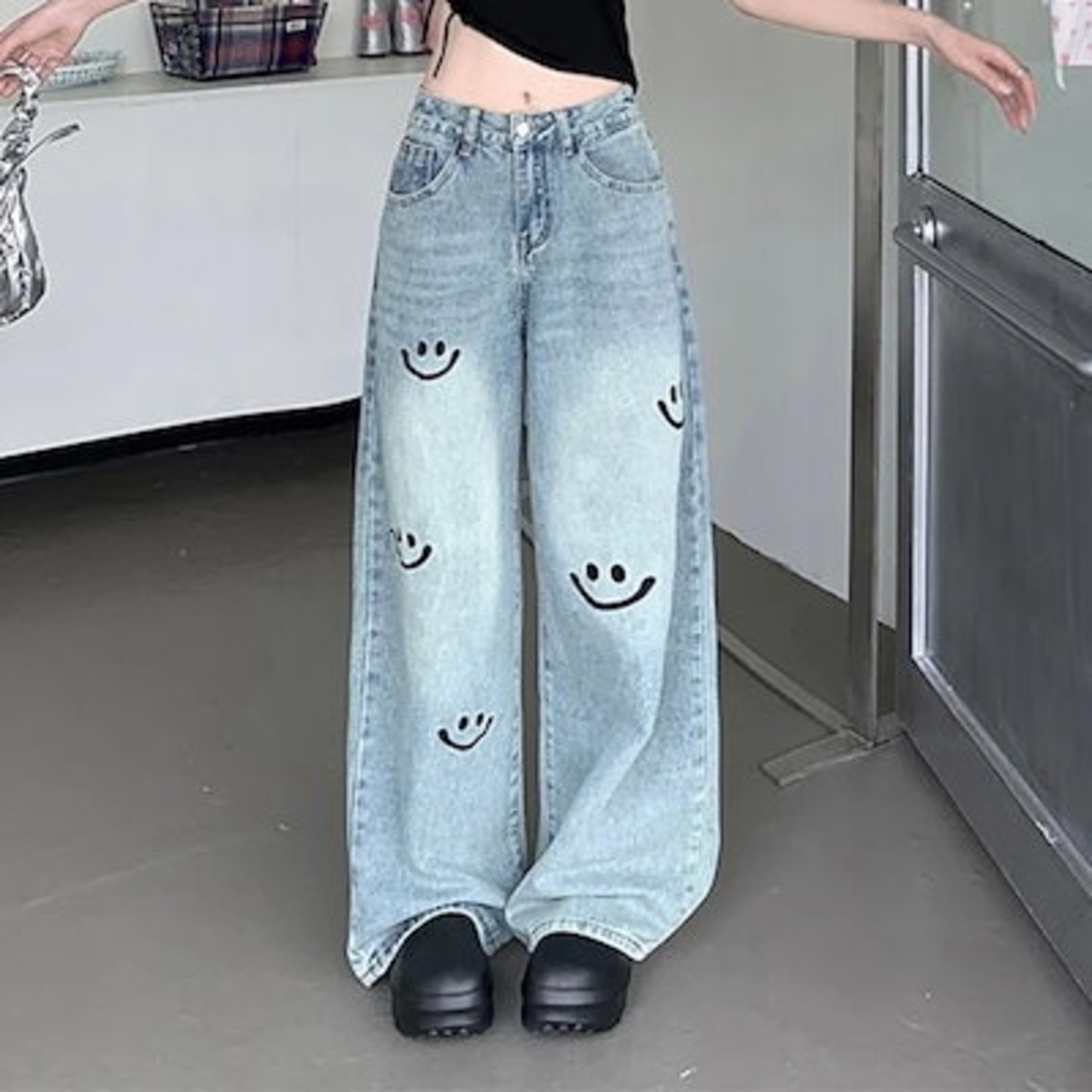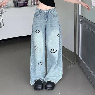 2025 春夏パンツ ロング丈 デニム ジーンズ ワイド ハイウエスト 美脚効果 脚長効果 細見え 夏 水色 ニコちゃん スマイル おしゃれ かわいい 韓国ファッション レディース お出かけ