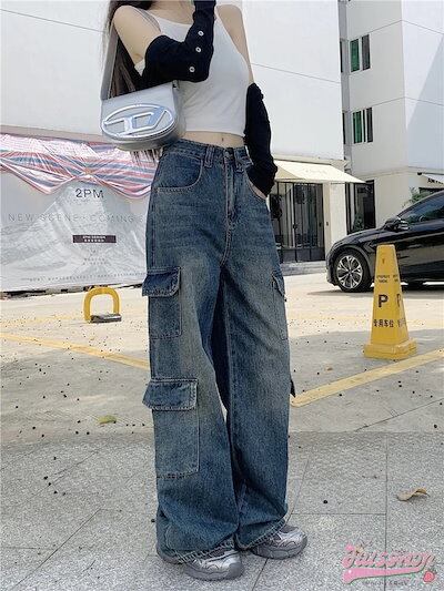 2025 春夏パンツ モップパンツ デニム ジーンズ ワイド ストレート ポケット ハイウエスト 脚長効果 美脚効果 細見え ウォッシュ加工 春 水色 カジュアル 韓国ファッション レディース お出か