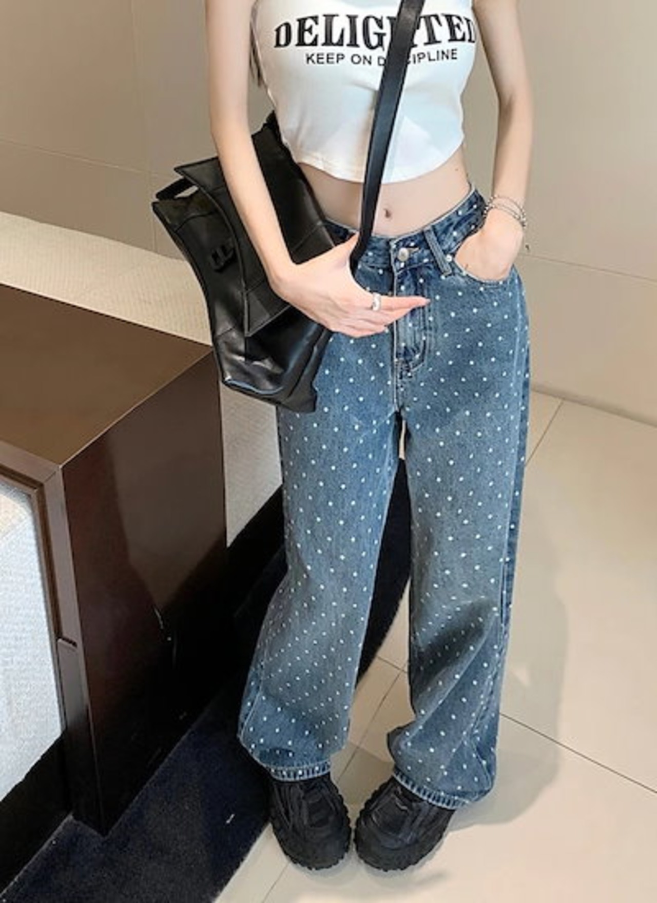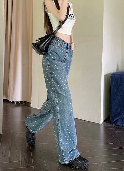 2025春夏パンツ デニム ジーンズ ドット柄 ワイド ストレート ハイウエスト 脚長効果 美脚効果 細見え 春 カジュアル おしゃれ かわいい 韓国ファッション レディース お出かけ