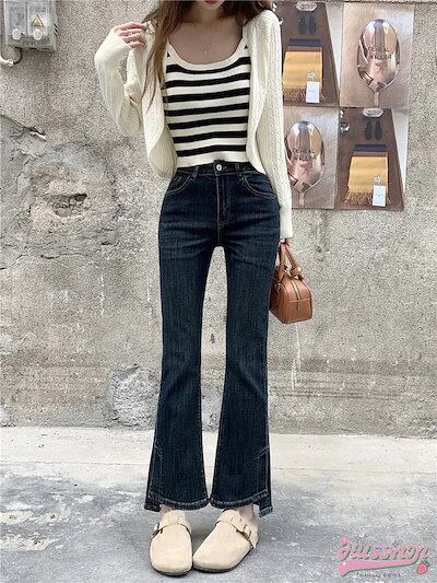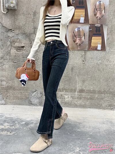 パンツ デニム ジーンズ スキニー ワイドレッグ スリット スリム ハイウエスト 脚長効果 美脚効果 細見え 春 黒 カジュアル 韓国ファッション レディース お出かけ