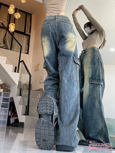 2025春夏パンツ デニム ジーンズ ワイド ストレート ハイウエスト 脚長効果 美脚効果 細見え ウォッシュ加工 ポケット 春 カジュアル 韓国ファッション レディース お出かけ