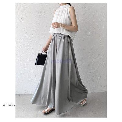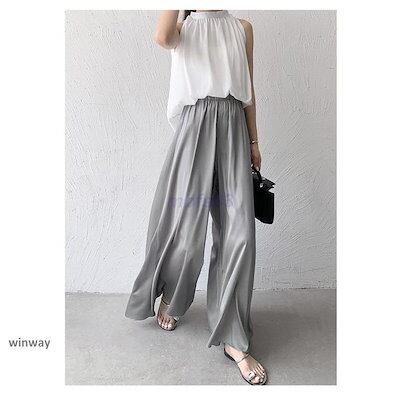 ワイドパンツ サテン レディース ボトムス ロング パンツ ウエストゴム 無地 ガウチョ 春 夏 秋 薄手 軽い お洒落 ルームウェア 着痩せ 細見え