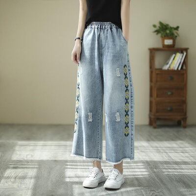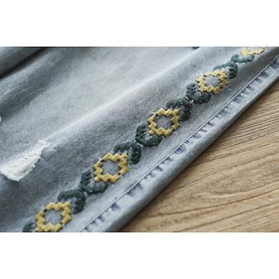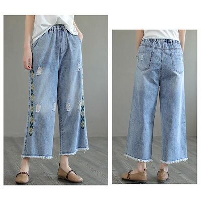 ジーンズ バギーパンツ ワイドパンツ 春 夏 秋 ダメージ ウォッシュ アンクル丈 刺繍 デニムパンツ レディース
