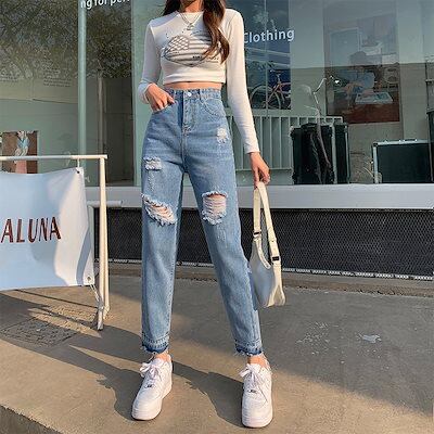 2024春夏 新作 おしゃれ 破れ穴 ゆったり ハイウエスト デニムパンツ 着痩せ カジュアル 九分丈パンツ 百掛けスラックスパンツ 韓国ファッション スキニーパンツ 脚長効果! ひんやりボトムス