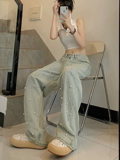 2024 新作 韓国 流行り おしゃれ 魅力を増すコツ INSスタイル 夏 ロングパンツ ワイドパンツ 真珠 ハイウエスト スリム ジーンズ