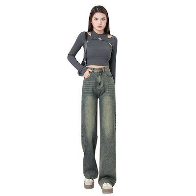 レトロなレトロな高腰垂直感ストレートジーンズ女性春秋新アメリカの高街が痩せている