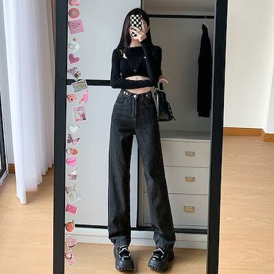 高腰広脚ジーンズ女性ゆるいストレート新春秋黒灰が痩せている