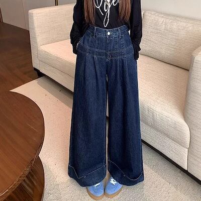 ファッション高腰広脚巻きジーンズ秋冬新デザイン感大サイズ垂感広脚ズボン