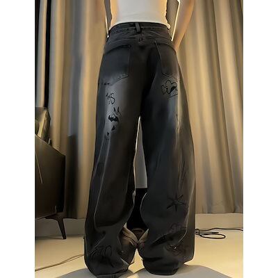 漫画落書き水洗いジーンズ女性春秋冬新ゆるいレトロモップ広い脚のズボン