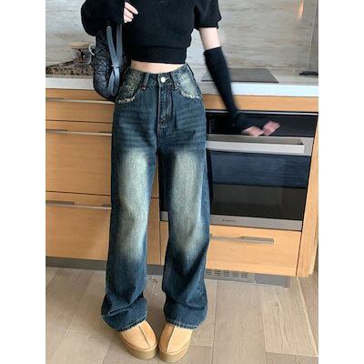 レトロにして古い水洗いストレートジーンズ女性秋冬の新商品はゆったりとしていて痩せています