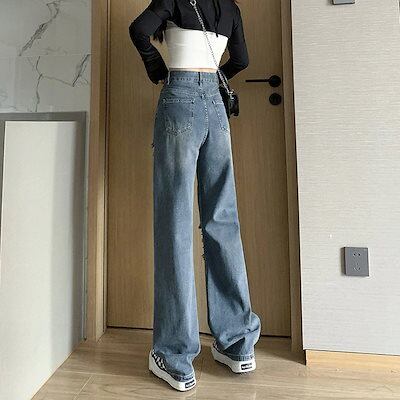 新作 ダメージジーンズ レディース 春夏 ハイウェスト ストレートパンツ ワイドパンツ モップパンツ