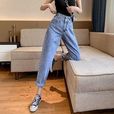 新作 ハイウェスト デニムパンツ レディース 新作 九分丈パンツ 着痩せ ハーレムパンツ