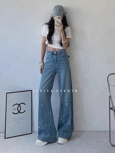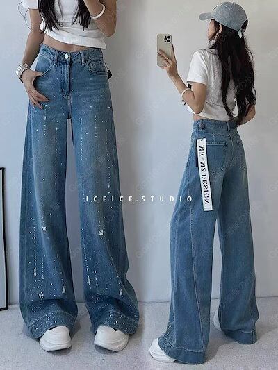 2025早春新作ハイウエストワイドパンツドリルリボンストレートジーンズレディースロングパンツ-37