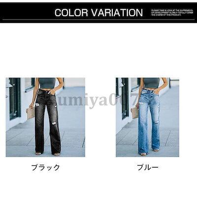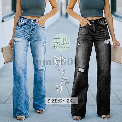 新作 ワイドパンツデニム ダメージ加工 レディース ゆったり ボトムス ジーンズ ハイウエスト おしゃれ ジーパン 着やせ ロングパンツ