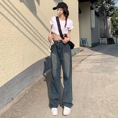 レトロなハイウエストデザイン感デニム女性の春の新作ゆったりストレートワイドパンツハイストリートinsラッシュデニムボトムス 2025 レディース
