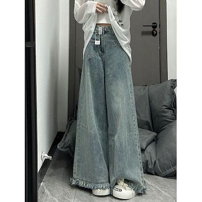 レトロ 切りっぱなし デニム ワイドパンツ 春新作 ハイウエスト 着痩せ モップ ロングズボン レディース ゆったり ジーンズ カジュアルパンツ