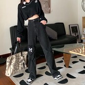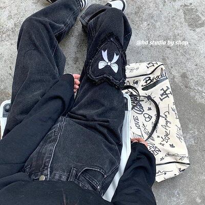 デニムハートリボンジーンズレディース春ins新作ゆったりハイウエストストレートワイドワイドスラックス学生ファッション