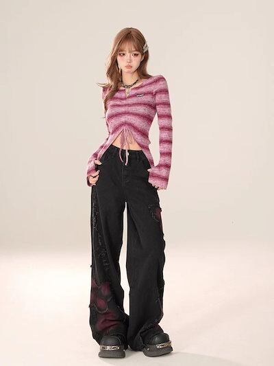 黒のぼかし蝶刺繍デザインワイドパンツレディース春の新作ハイウエストゆったり着やせロングパンツ