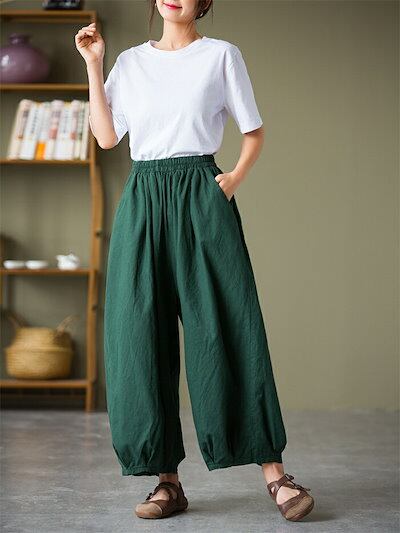 バルーンパンツ パンツ レディース サルエルパンツ ロング丈パンツ ボリェーム感 ウエストゴム アンクルパンツ サイドポケット ハイウエスト リネンパンツ 綿麻 体型カバー 長ズボン ロングパンツ ワ