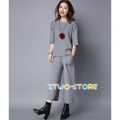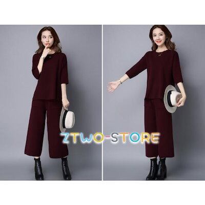 セットアップ ニット レディース パンツスーツ おしゃれ シンプル きれいめ カジュアル 五分袖 トップス アンクルパンツ 大きいサイズ 3L 4L 黒 赤