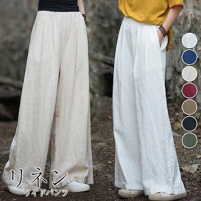 ワイドパンツ リネン レディース きれいめ 春 夏 パンツ亜麻 麻 涼しい コットン フレア ロング ウエストゴム 体型カバー 美脚 ファッション ズボン 快適 ゆったり リラックス カジュアル き