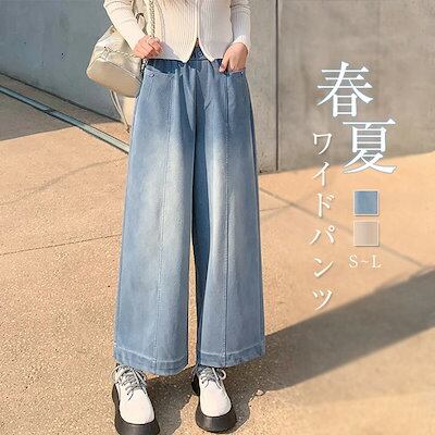 ワイドパンツ レディース ストレートパンツ デニムパンツ ワイドパンツ 春夏 ウエストゴム ロング丈 ボトムス リラックス ゆったり 楽ちん おしゃれ シンプル ポケット付き 体型カバー 着痩せ 定番