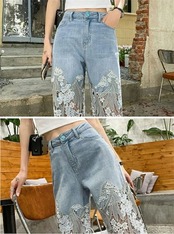 デニムパンツ レディース レース デニム 切り替え 春夏秋 透け感 透かし彫り 花柄 ロング丈 ストレートパンツ ジーンズ 体型カバー ボトムス ズボン ゆったり ハイウエスト 着痩 脚長 大きいサイ