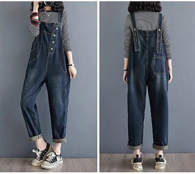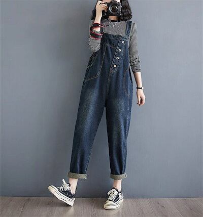前後2Way デニムサロペット レディース コーデ 秋 サロペット デニム 大きいサイズ ワイド パンツ オーバーオール ロング 体型カバー ゆったり 楽ちん 大人 デニムワイドパンツ 春 夏 秋 無