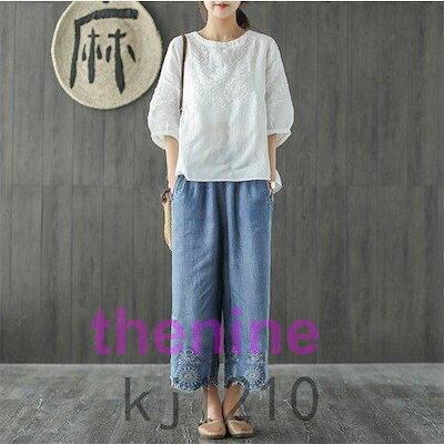 新しい夏のスタイル レディースワイドパンツ/レトロ/デニムパンツ/ストレートズボン/春秋ガウチョジーンズ/裾レース刺繍/美尻/紐付き/ゆったり/着回し/普段着/森ガール二枚