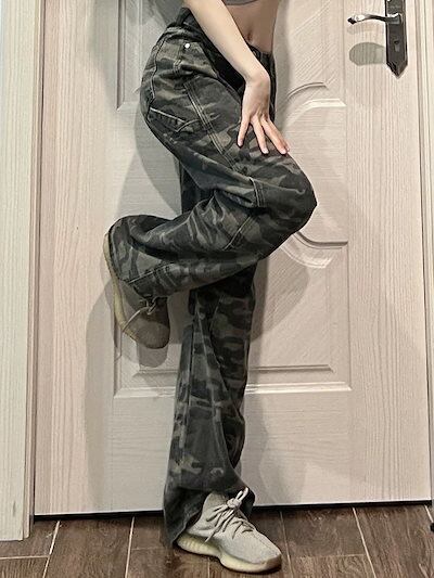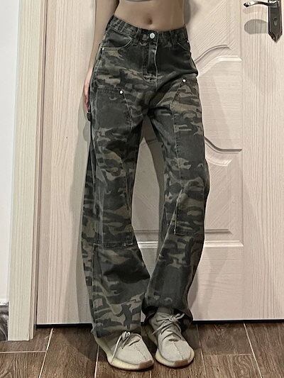 ワイドパンツ ジーンズ レディース カモフラージュ スト ズボン ゆったり ワイドレッグパンツ晩春