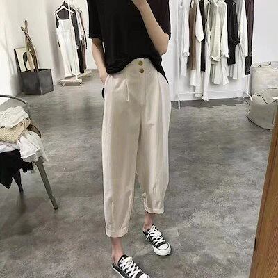 テーパードパンツ ボタンカジュアルパンツレディース新作ハイウエストルーズ韓国ゴムハーレムパンツパンツ