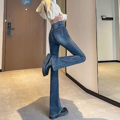 脚長効果! デニムパンツレディース スリムフィットハイウエストストレートフレアパンツ