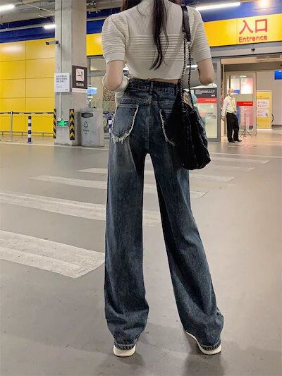 デニムパンツ デザイン感のあるリバーシブルジーンズレディース秋の新作ハイウエストストレートパンツゆったりinsスリムワイドパンツ
