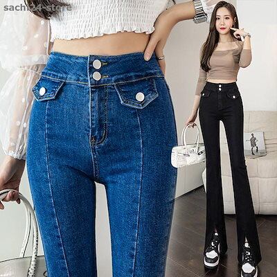 デニムパンツ レディース フレアパンツ スリット デニム ロングパンツ ハイウエスト 美脚 脚長 韓国 スリム デイリーコーデ カジュアル ジーンズ