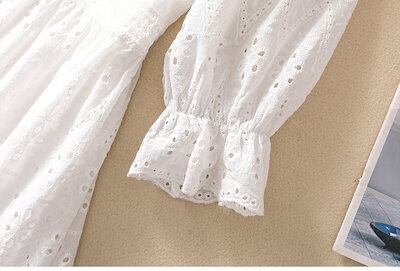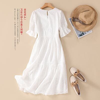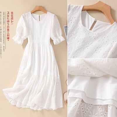 ホワイト ラウンドネック レースワンピース 新作 ウエストシェイプ スリムシルエット ロングドレス レディース