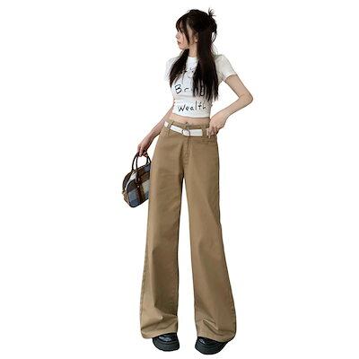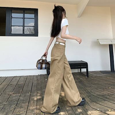 ニッチなレトロブラウンのワイドレッグジーンズレディースミッドウエストゆったりスリミング個性的オールマッチストレートレッグフロアレングスパンツ