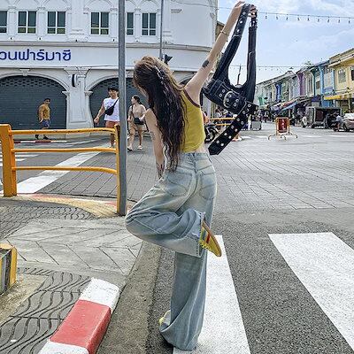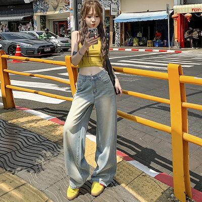 レトロで懐かしいカラーのテンセルワイドレッグジーンズレディースハイウエストゆったりスリム個性的なストレートパンツ