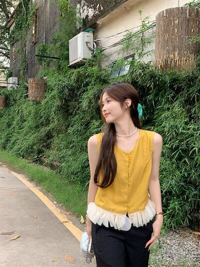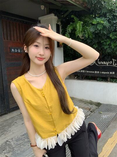 2024 春夏トップス シャツ ノースリーブ ボタン ラウンドネック フリル ゆったり 細見え 夏 黄色 イエロー おしゃれ かわいい 韓国ファッション レディース お出かけ