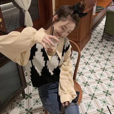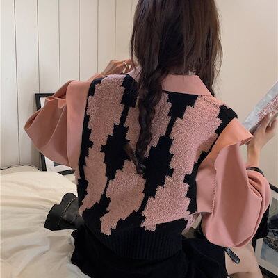 2024 春夏【2点セット】カジュアルにも シャツ ニット ベスト ブラウス バルーン ボリューム ショート風ゆったり ネック カジュアル きれいめ 韓国っぽ ファッション かわいい