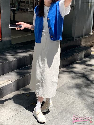 スカート デニム生地 ミディアム丈 スリット バックオープン ハイウエスト 脚長効果 美脚効果 細見え 春 白 水色 紺色 かわいい おしゃれ カジュアル 韓国ファッション レディース お出かけ