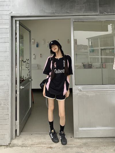 2024 夏 韓国 甘い 可愛い風トップス Tシャツ ファッション系半袖スリムフィットサイドペイントシルエットゆったり丈 休日レディースサイズ韓国Vネック おしゃれカジュアルメンズライク T