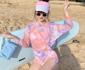 2色 タンキニ 水着 レディース 3点セット Tシャツ ラッシュガード カジュアル タイダイ シャーリング スポーティー 体型カバー 水着 セパレート 上下セット ビキニ ショートパンツ ピンク グリ