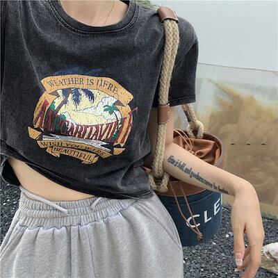 2024 夏 韓国 甘い トップス Tシャツ ラウンドネック 休日 ファッション スリムフィット加工風丈短め ショート カットソー レディース 韓国系 休日 おしゃれ T