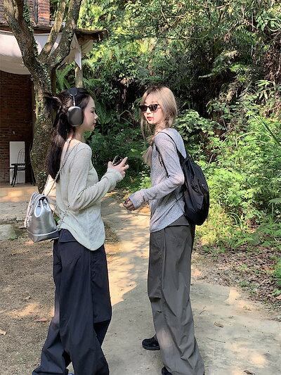 2024 春 透け感UP tシャツ ファッション 韓国 トップス デザイン カットソー イラストエンジェル 長袖丈パンツ