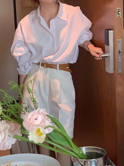 2024秋冬トップス シャツ 襟 スタンダードカラー ストライプ ボタン 長袖 ゆったり 秋 白 青 水色 おしゃれ かわいい 韓国ファッション レディース お出かけ